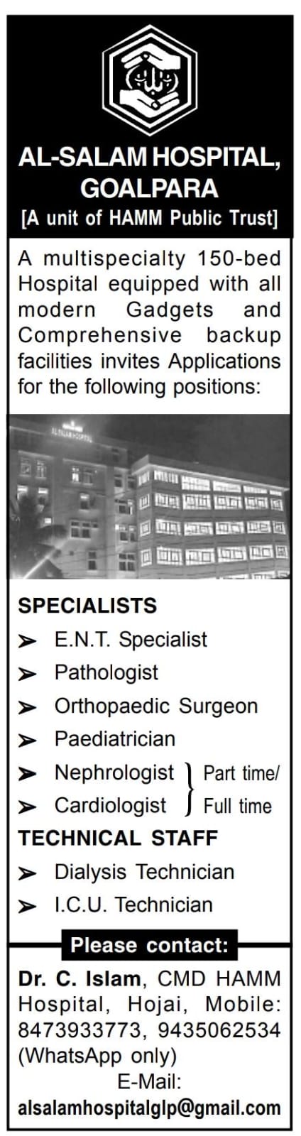 AL-Salam Hospital Recruitment 2025 :- AL-Salam Hospital, Goalpara, a unit of HAMM Public Trust, has released a new recruitment notification for various Specialist Doctors and Technical Staff positions. This is a great opportunity for medical professionals to work in a modern, multi-specialty hospital equipped with advanced facilities.
