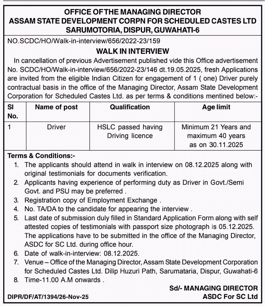 ASDC Recruitment 2025:Assam State Development Corporation for Scheduled Castes Ltd (ASDC for SC Ltd) has released an official notification for the recruitment of 1 Driver post on a purely contractual basis. Interested and eligible candidates are invited to attend the Walk-in Interview scheduled on 08 December 2025.