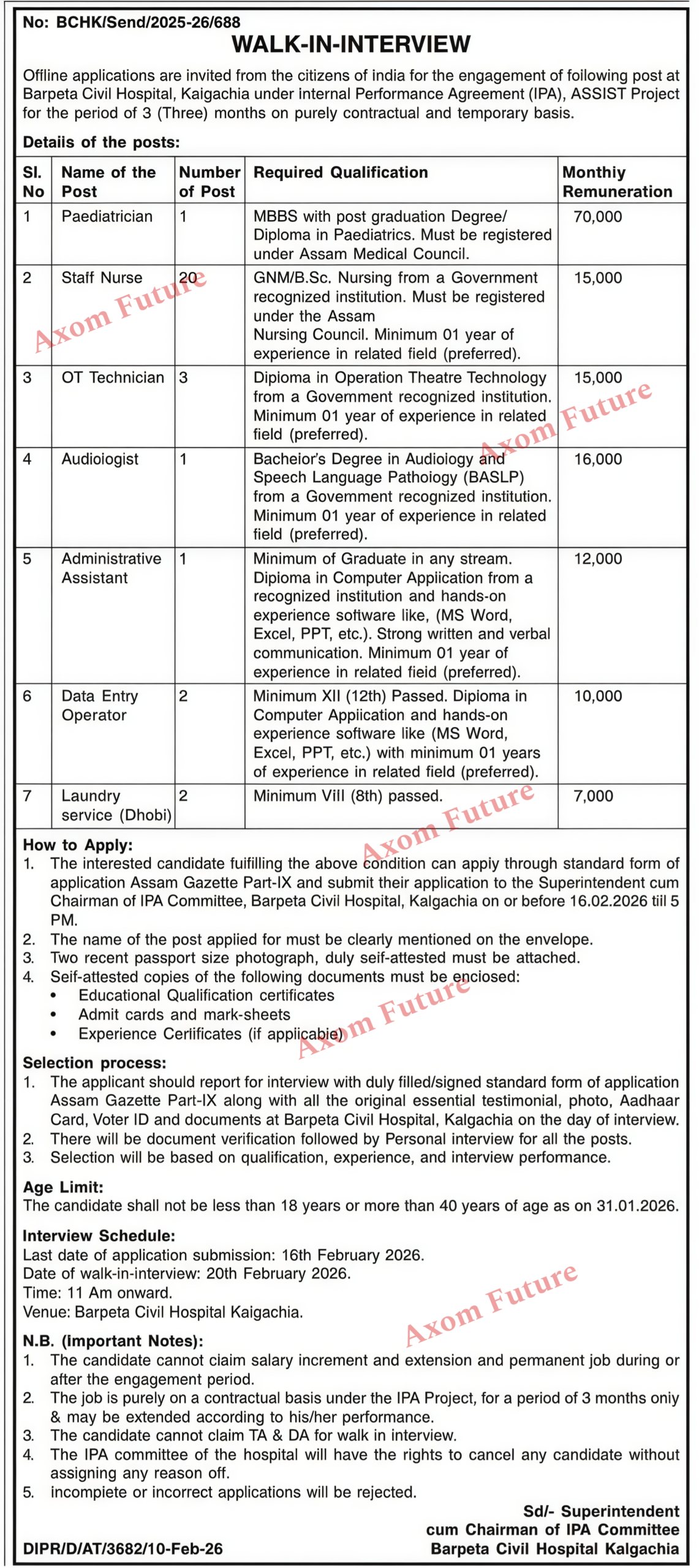 3. Submit Application: Submit the filled application to the Superintendent cum Chairman of IPA Committee, Barpeta Civil Hospital, Kalgachia on or before 16.02.2026 (5:00 PM).
