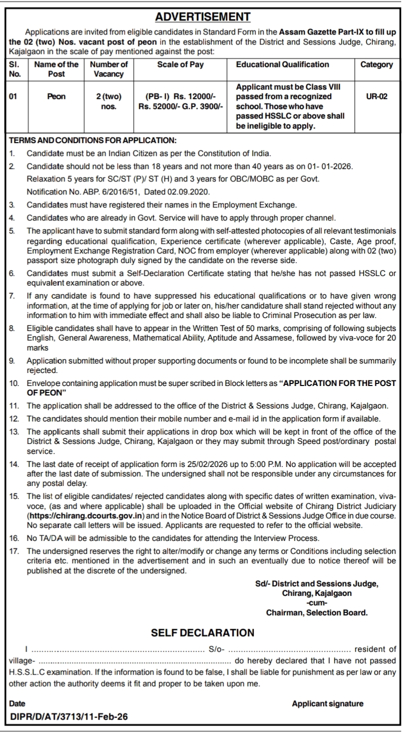 Chirang Judiciary Recruitment 2026- The Office of the District and Sessions Judge, Chirang, Kajalgaon, has officially released an advertisement for the recruitment of Peon vacancies. Interested and eligible candidates can apply in the Standard Form of Application as published in the Assam Gazette Part-IX.