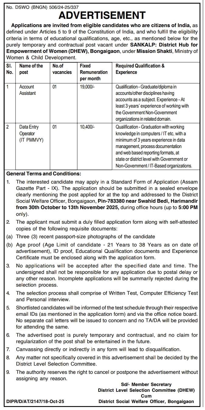 DHEW Bongaigaon Recruitment 2025 :- District Hub for Empowerment of Women (DHEW), Bongaigaon under Mission Shakti, Ministry of Women & Child Development, has released an official recruitment advertisement for two contractual posts — Account Assistant and Data Entry Operator (IT PMMVY).