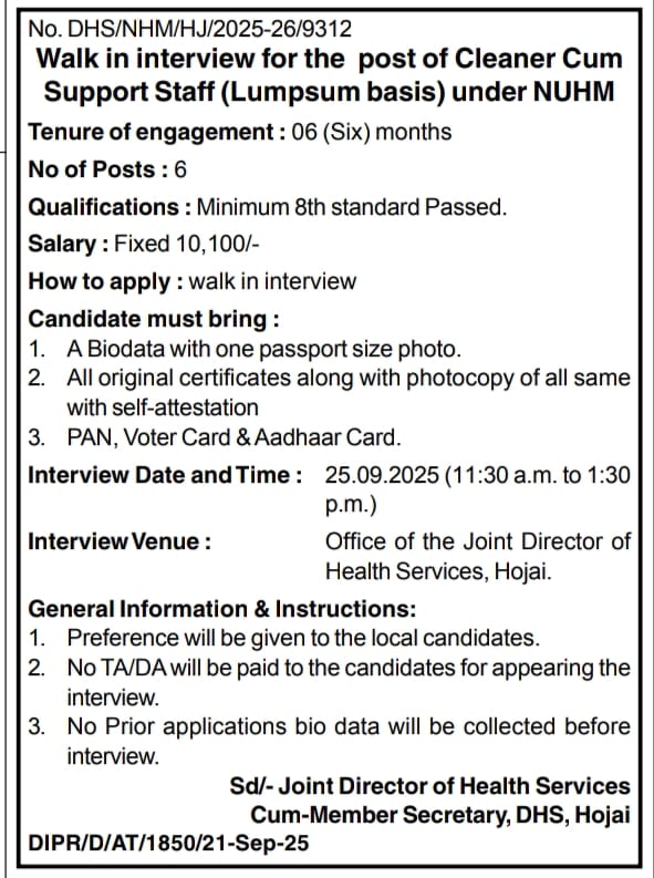 NUHM Recruitment 2025:- The Office of the Joint Director of Health Services, Hojai, has released an official notification for the recruitment of Cleaner Cum Support Staff on a lumpsum basis under NUHM. Eligible candidates are invited for a walk-in interview as per the details below.