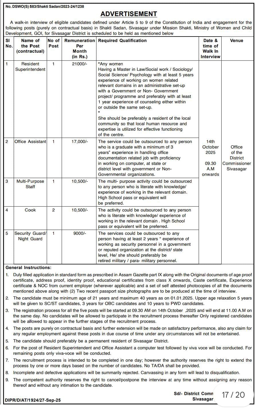 A walk-in interview is scheduled for 14th October 2025. Interested and eligible candidates who are permanent residents of Sivasagar District are invited to appear for the interview with their application and all required documents.
