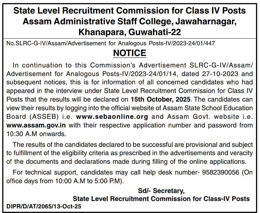 SLRC Grade 4 Result:- The State Level Recruitment Commission (SLRC) for Class IV Posts under the Assam Administrative Staff College, Khanapara, Guwahati-22, has officially announced that the results of Class IV posts will be declared on 15th October 2025. State Level Recruitment Commission (SLRC), Assam.