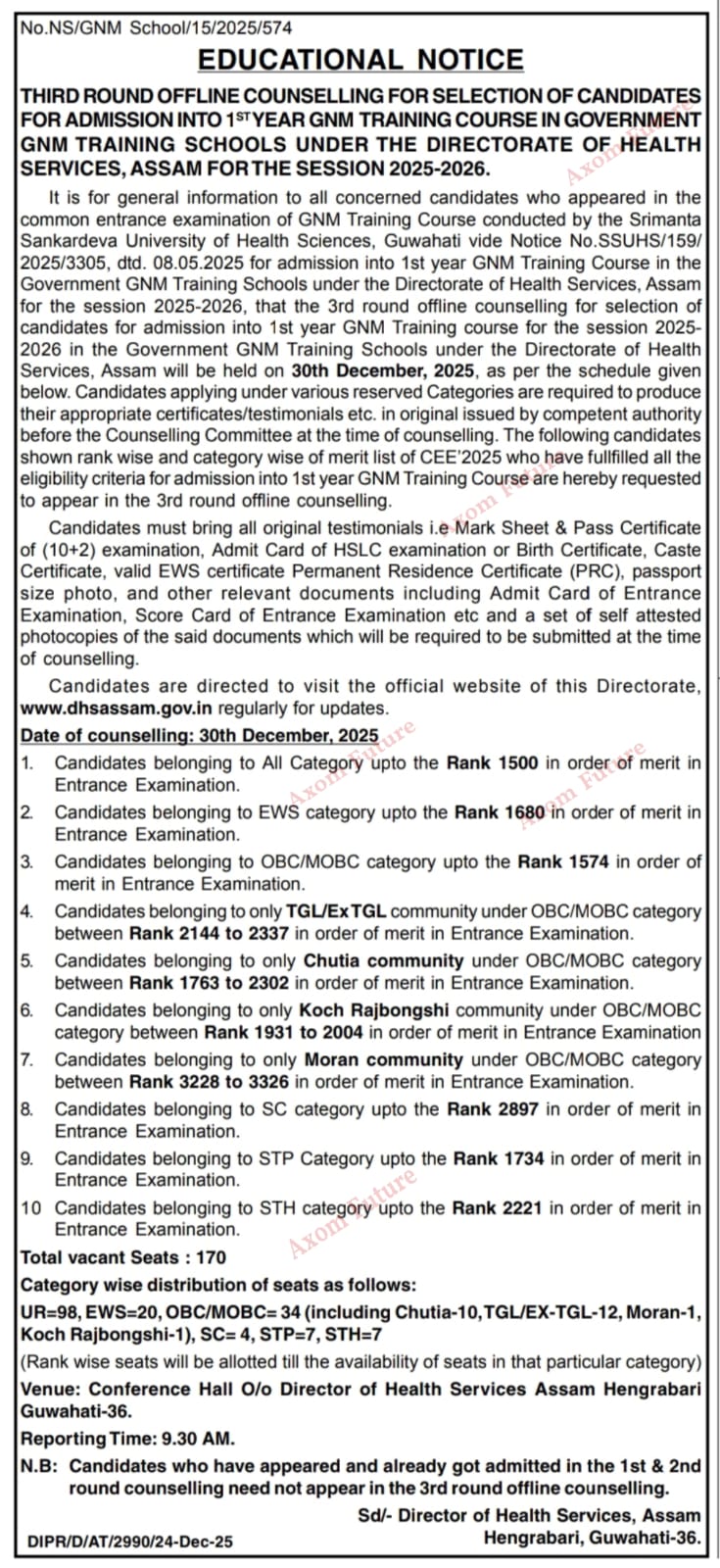 SSUHS GNM Nursing 3rd Counselling 2025:- The Directorate of Health Services (DHS), Assam has officially released the Educational Notice for the 3rd Round Offline Counselling for admission into the 1st Year GNM Training Course in Government GNM Training Schools for the session 2025-2026. Candidates who appeared in the Common Entrance Examination (CEE 2025) conducted by Srimanta Sankaradeva University of Health Sciences (SSUHS) and meet the specified cutoff ranks are invited to attend.